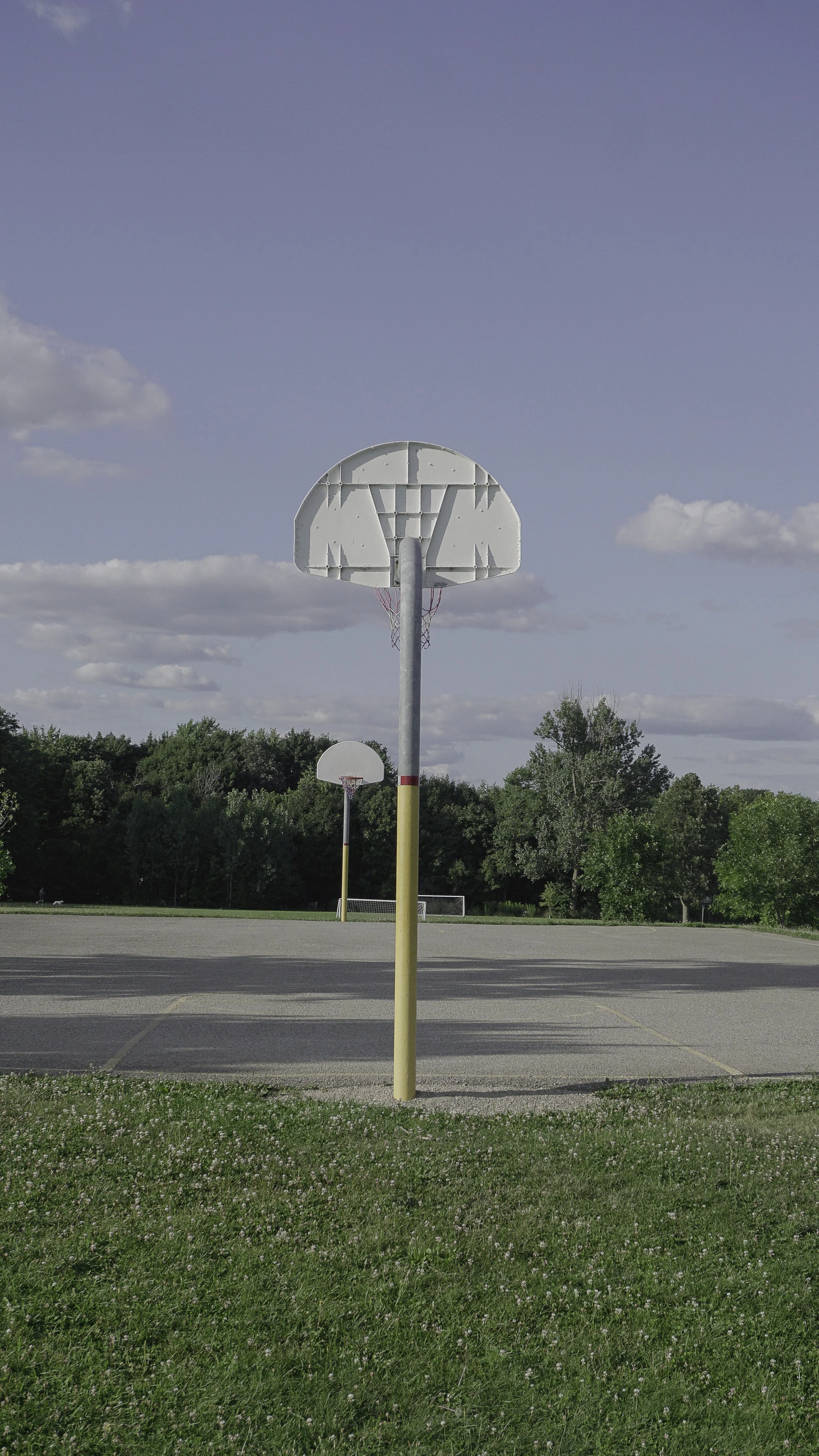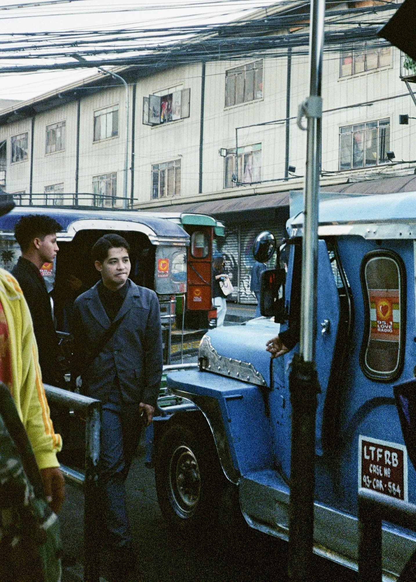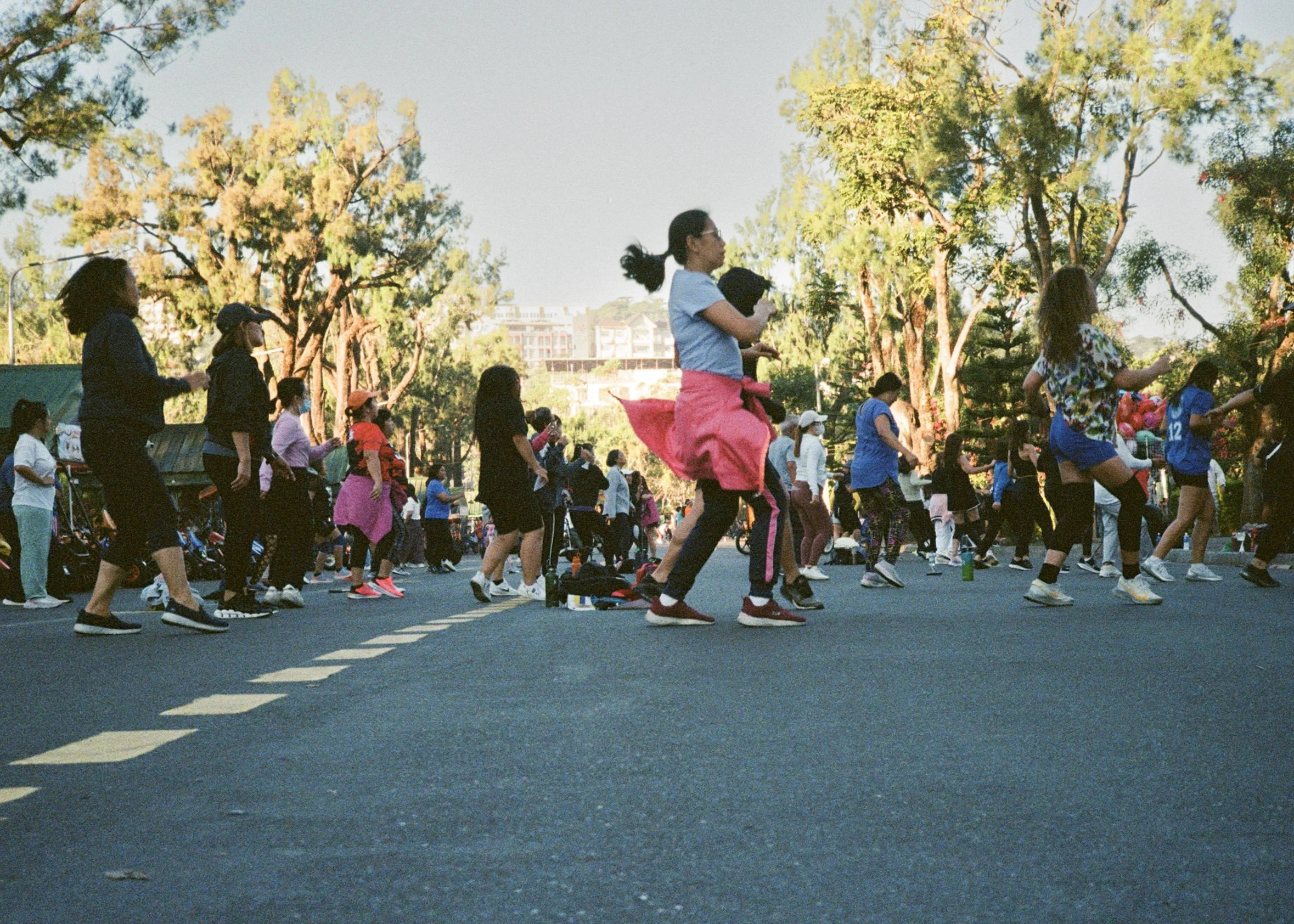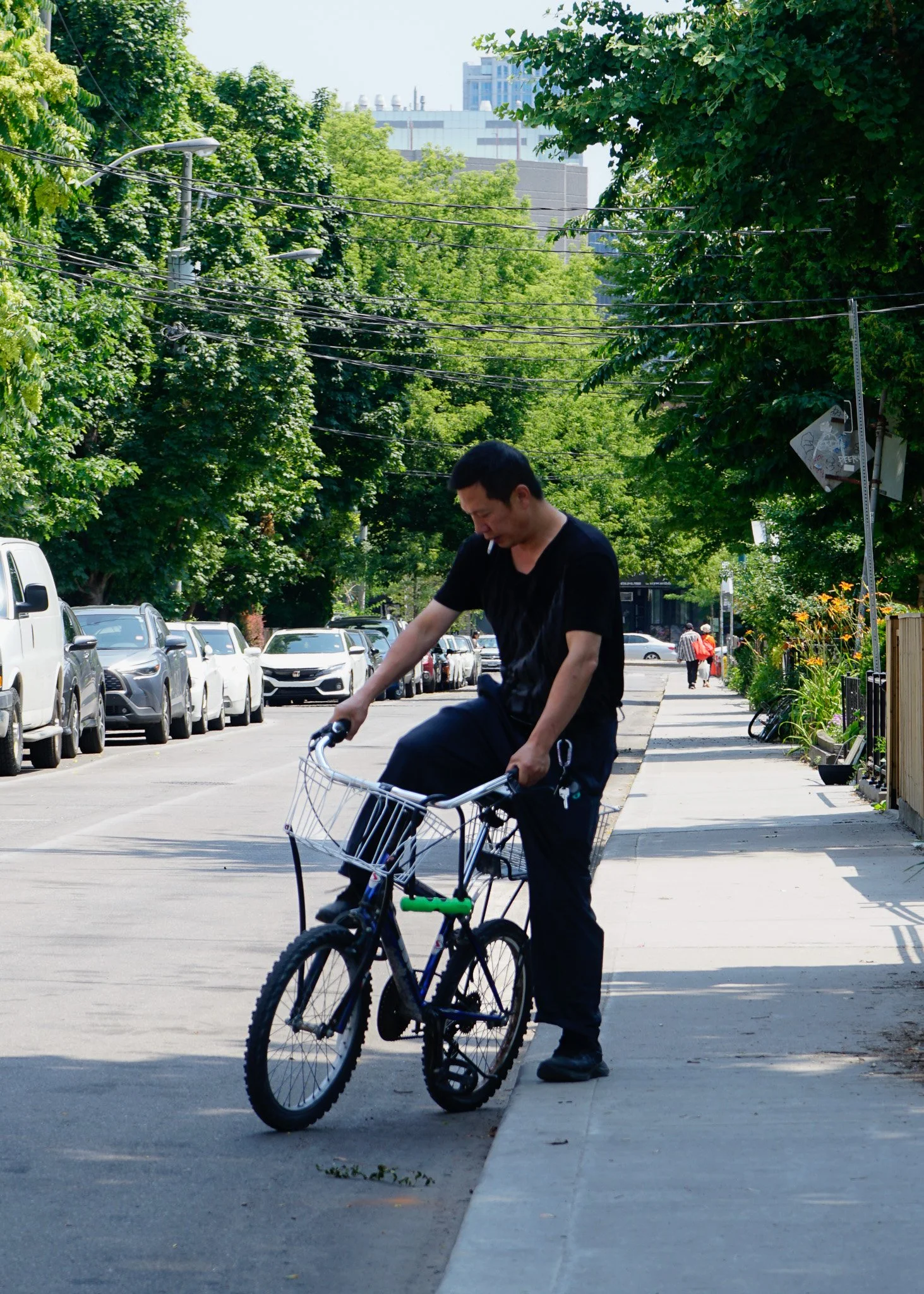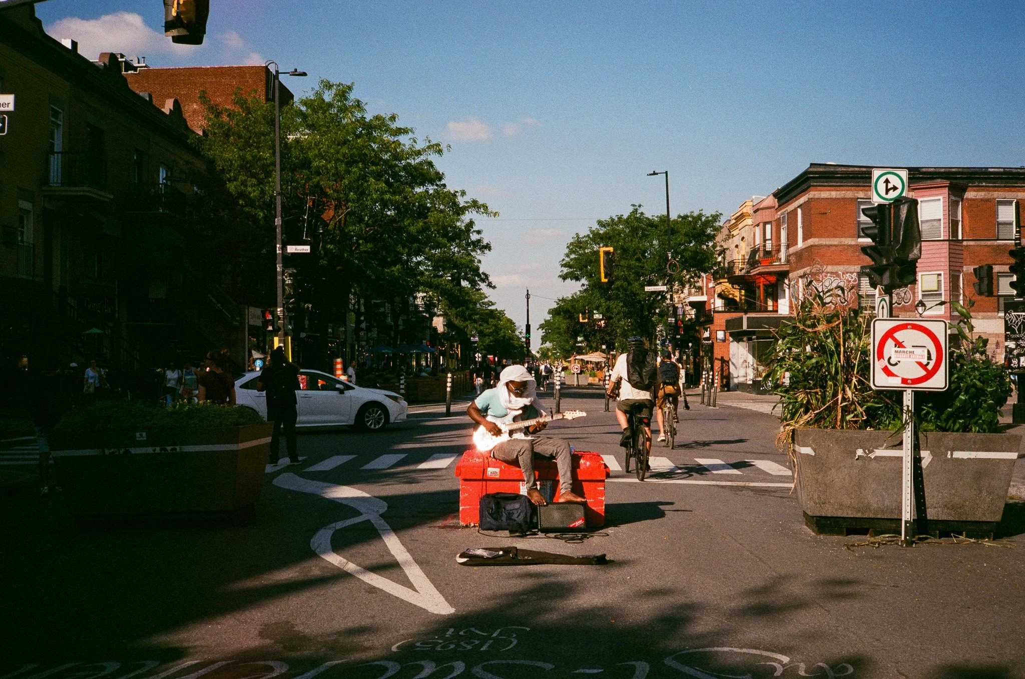 Street scene with a musician playing guitar seated on a red bench, surrounded by trees, buildings, and a cyclist passing by. Urban setting with signage and traffic lights.